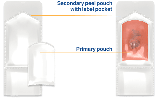 The CV line consists of a primary (inner) pouch, designed with a rounded structure to cradle CV tissues securely. The inner pouch fits perfectly within an outer peel pouch, providing full protection and ease of handling. The dual-pouch system also allows for the aseptic presentation of tissues within the operating room.